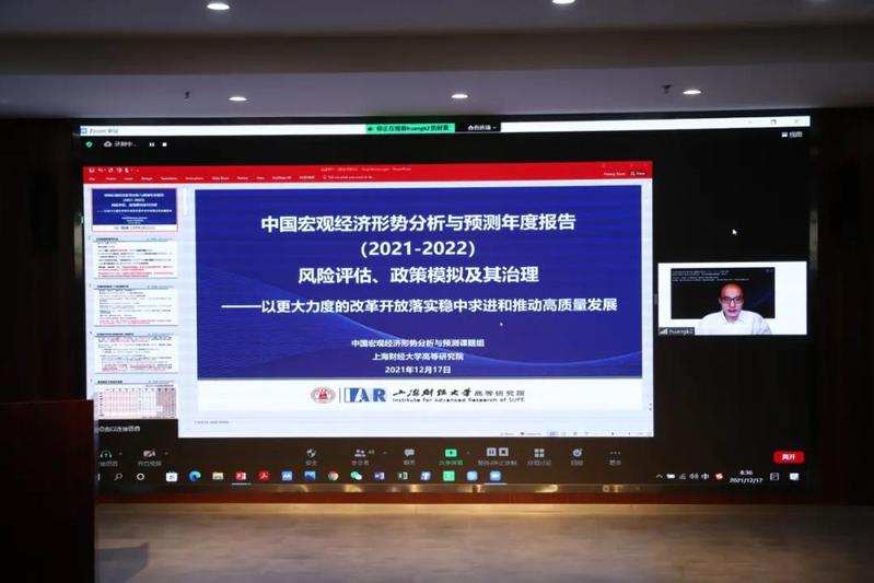 12月17日,《中国宏观经济形势分析与预测年度报告(2021-2022)》发布会在上海财经大学高等研究院举行。本次会议主题为“以更大力度的改革开放落实稳中求进和推动高质量发展”,采取线上线下相结合的方式举行。国家统计局原副局长、清华大学经济管理学院许宪春教授,中国人民银行调查统计司原司长、上海财经大学盛松成教授,中国证监会中证金融研究院副院长谈从炎博士,同济大学经济与金融系主任、校务委员会委员钟宁桦教授,软库中华金融集团有限公司(香港)曹国琪董事长,江苏和泰投资有限公司董事长、百联挚高基金创始合伙人、上海财经大学吴亚东校董,上海昶元投资管理有限公司张秋总经理等嘉宾出席发布会。上海财经大学高等研究院“中国宏观经济形势分析与预测”课题组总负责人田国强教授,首席专家黄晓东教授和课题组成员,以及来自政府、金融机构、媒体等各界人士参加发布会。发布会由高等研究院院长助理陈媛媛主持,副院长林立国,院长助理陈旭东、龚关、杨有智、朱冬妮及全院教师等出席会议。