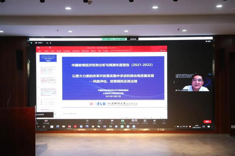 随后,黄晓东教授代表课题组对《中国宏观经济形势分析与预测年度报告(2021-2022)》进行了详细解读,探讨风险评估、政策模拟及其治理。面对我国经济总体保持恢复态势,课题组预计全年GDP增速8.0%。课题组充分重视对各种风险的防范和化解,对不同情景下的经济走势、短期政策应对和中长期治理,给出了有针对性的结果和观点。基于上海财经大学高等研究院中国宏观经济预测模型(IAR-CMM)的情景分析和政策模拟结果,课题组测算,在基准情景下,2022年全年实际GDP增速约为5.5%,CPI增长1.8%,PPI增长3.9%,GDP平减指数增长3.2%,消费增长6.5%,投资增长5.1%,出口增长11.3%,进口增长11.8%,人民币兑美元汇率(CNY/USD)将在6.4附近宽幅双向波动。考虑到“双碳”目标严格执行、房地产税的实施、有效竞争推进、民营企业违约风险上升等因素,课题组就6种不同情景得出全年GDP增速分别为5.4%、5.2%、4.5%、5.8%、5.9%、6.1%。课题组还就不同情景下的政策选项给出了建议。