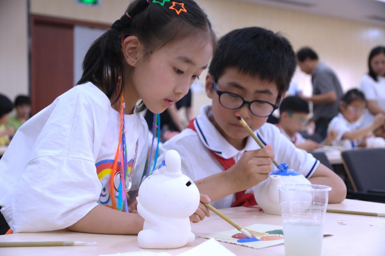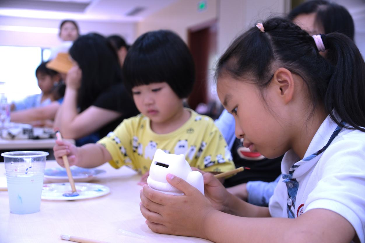 陶瓷彩绘体验区,专业老师指导孩子们用五彩颜料为陶艺坯体绘制图案,这些作品将由校方统一烧制,完成后作为“六一”亲子纪念赠予小朋友,所有参与的家庭都期待着将这份亲手创作的艺术品带回家珍藏。