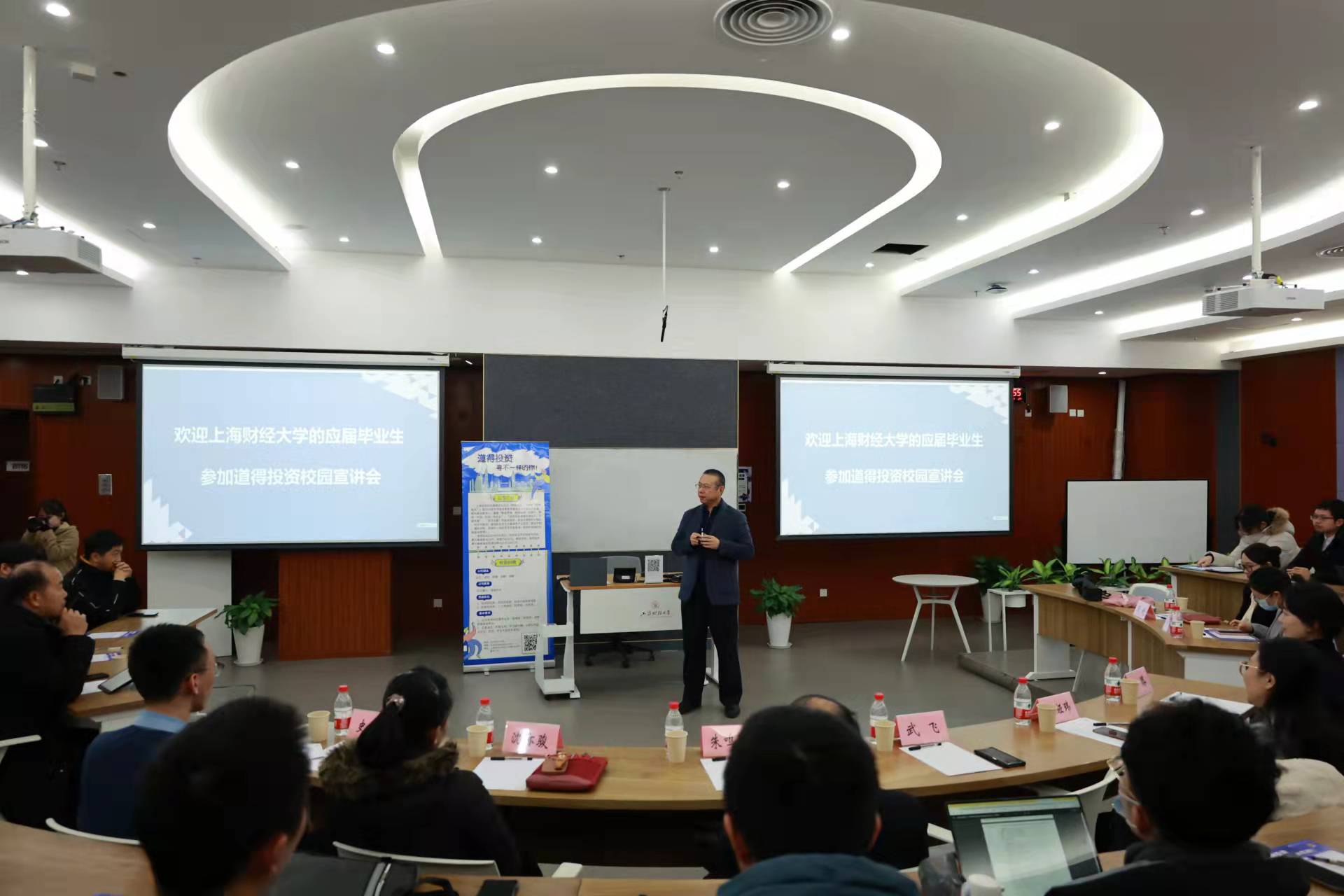 12月27日,明德专场校园招聘——上海道得投资管理合伙企业(有限合伙)(简称“道得投资”)招聘宣讲会在科研实验大楼B116如期举行,上海财经大学党委副书记朱鸣雄,上海道得投资管理合伙企业创始人、上海财经大学校董、校友、明德训练营项目捐赠人武飞先生等企业嘉宾和校团委、武装部相关负责人共同出席了本次活动。本次宣讲招聘会吸引到80余名同学参加,覆盖本科生、研究生,以及明德往届学员和上财退伍学生。