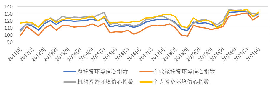 图2上海市投资者信心指数2011年第4季度至2021年第4季度核心指数运行情况图