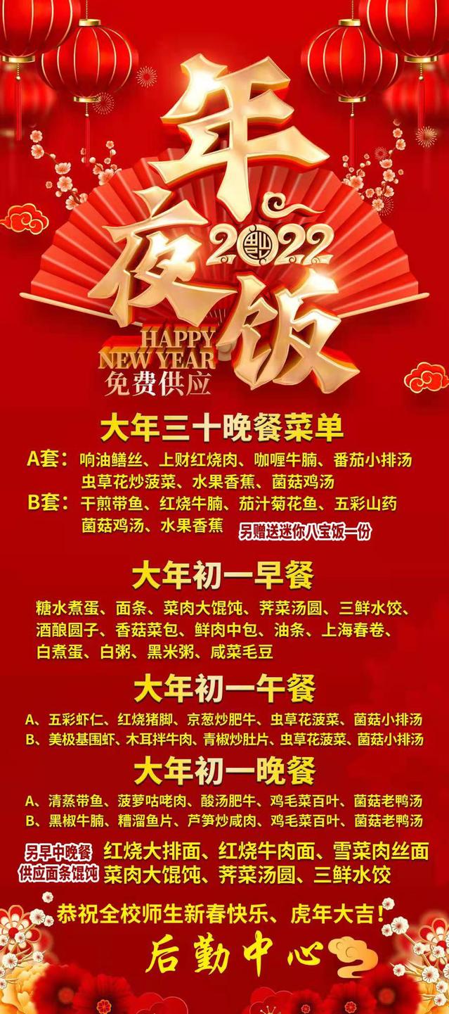 除夕晚餐、大年初一早中晚餐,食堂大厨提前定制春节套餐,为留校师生免费提供新春佳肴。