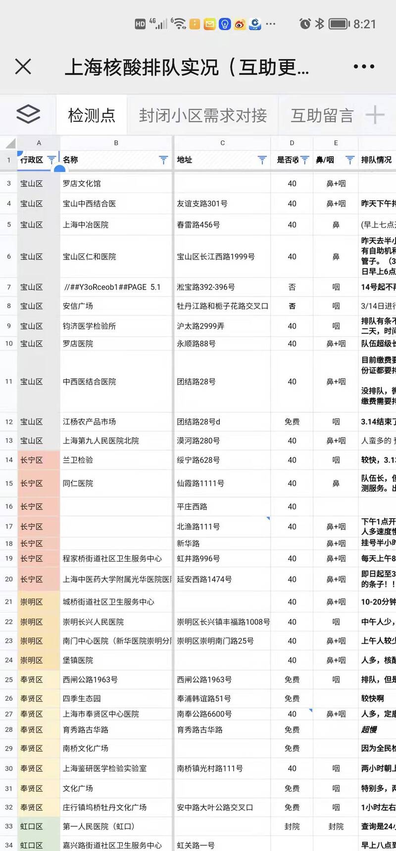 记者扫描二维码进入文档后看到,核酸检测点按不同区标识了不同颜色,并把同一个区的核酸检测点整合在一起,十分清晰明了。其中,排队情况是描写最详细的。“看运气,有时人少有时人多,上周五排队1小时,每周只有工作日早上8-10点。”“人较少,排队有条不紊,需提前手机小程序预约。”“人蛮多的,预计排队2小时左右。”“队伍长,但10个窗口同时做,半小时就能排到,可用医保,出结果快。”“排队10-15分钟。”……