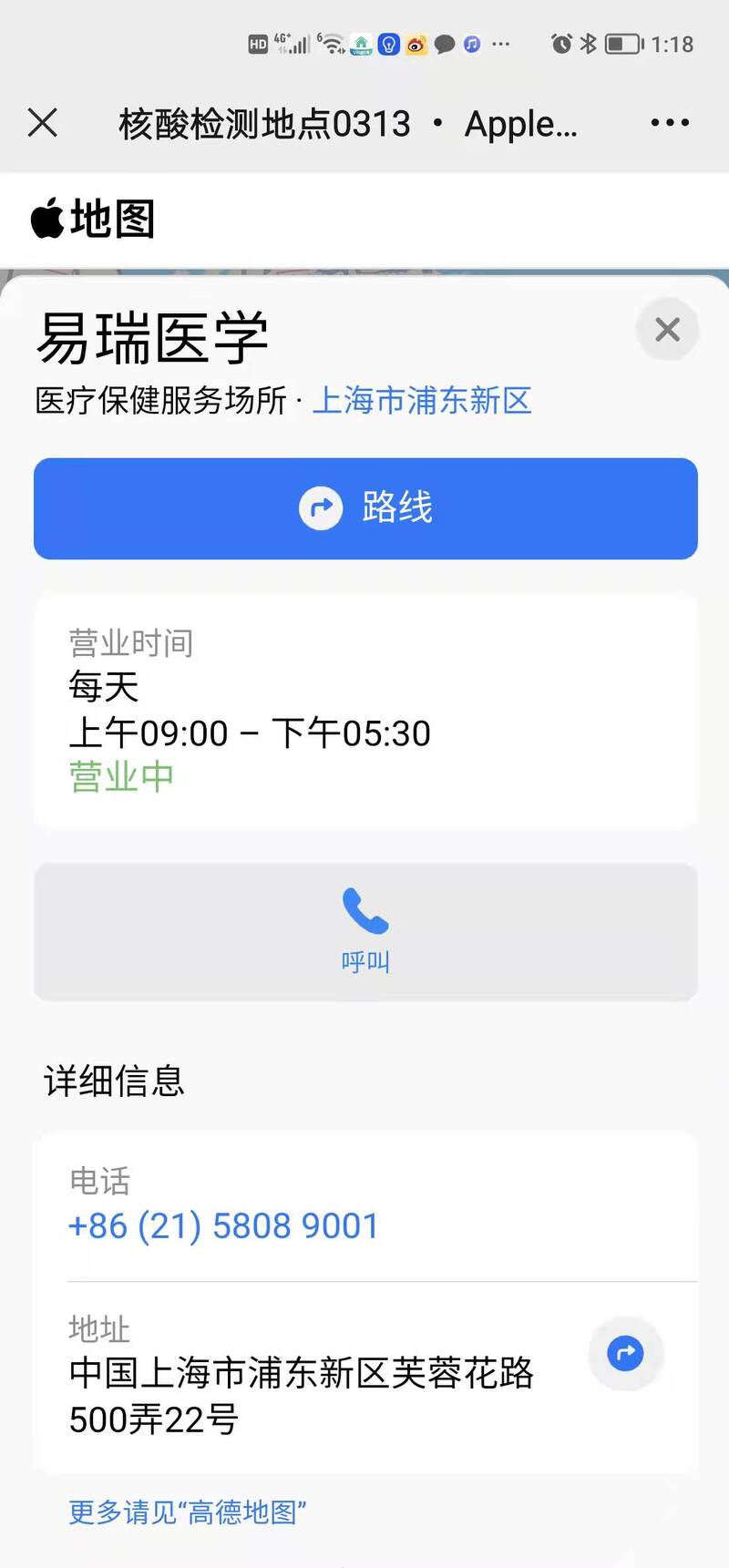 记者点击进入这份核酸检测地图看到,一张可放大缩小的地图上,密密麻麻地显示着红点,每一个红点就表示一个核酸检测点。放大后,可以清晰地看到核酸检测点旁边的路名。点击其中任意一个核酸检测点,开放时间、电话、地址都可一一看见。如果想查询怎么到达检测点,点击“路线”,系统便会自动应用手机中已下载的导航软件,显示公共交通、驾车、步行、骑行等各种路径。