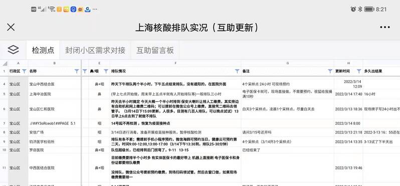 从3月13日中午11时开始,一份名为“上海核酸排队实况”的共享式腾讯文档在朋友圈频繁转发。文档的内容是上海各区核酸检测点的地址、实时排队情况、收费等情况,这份文档开放给所有人,可以随时在线编辑,更新检测点情况。