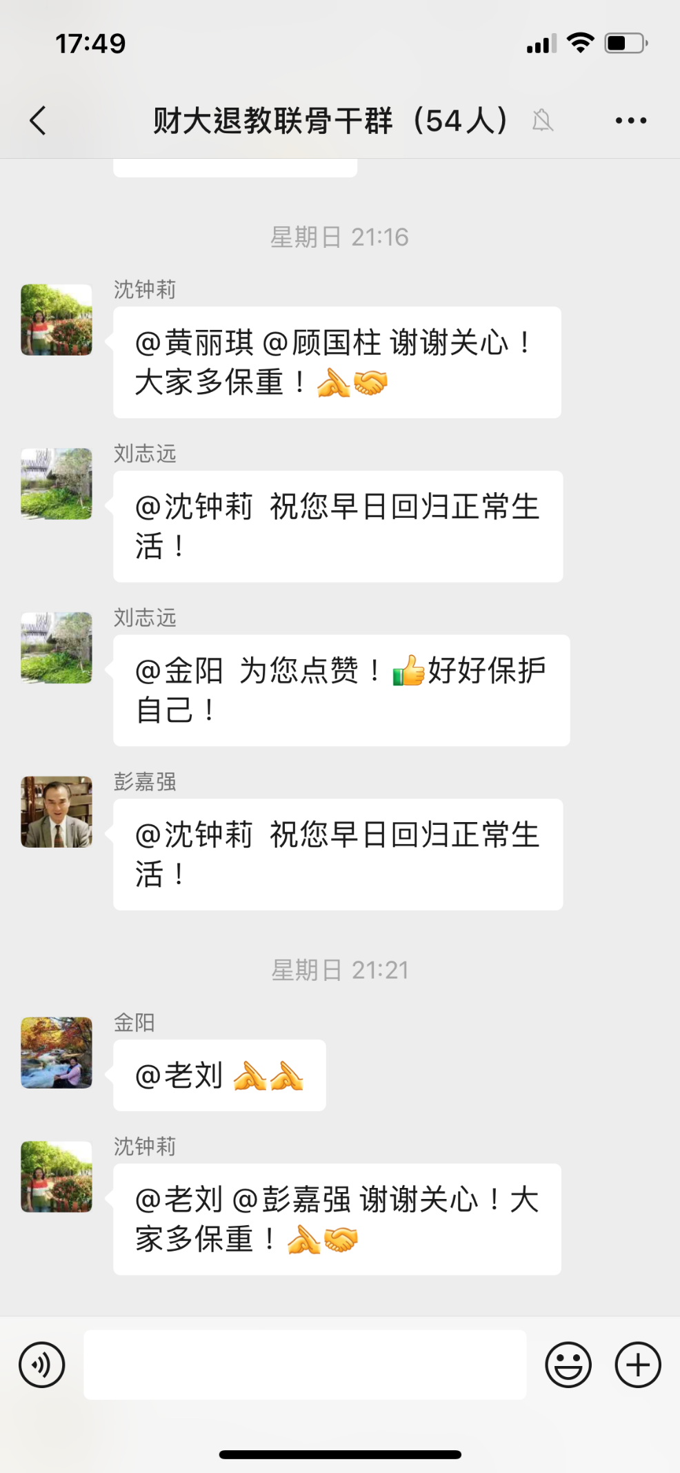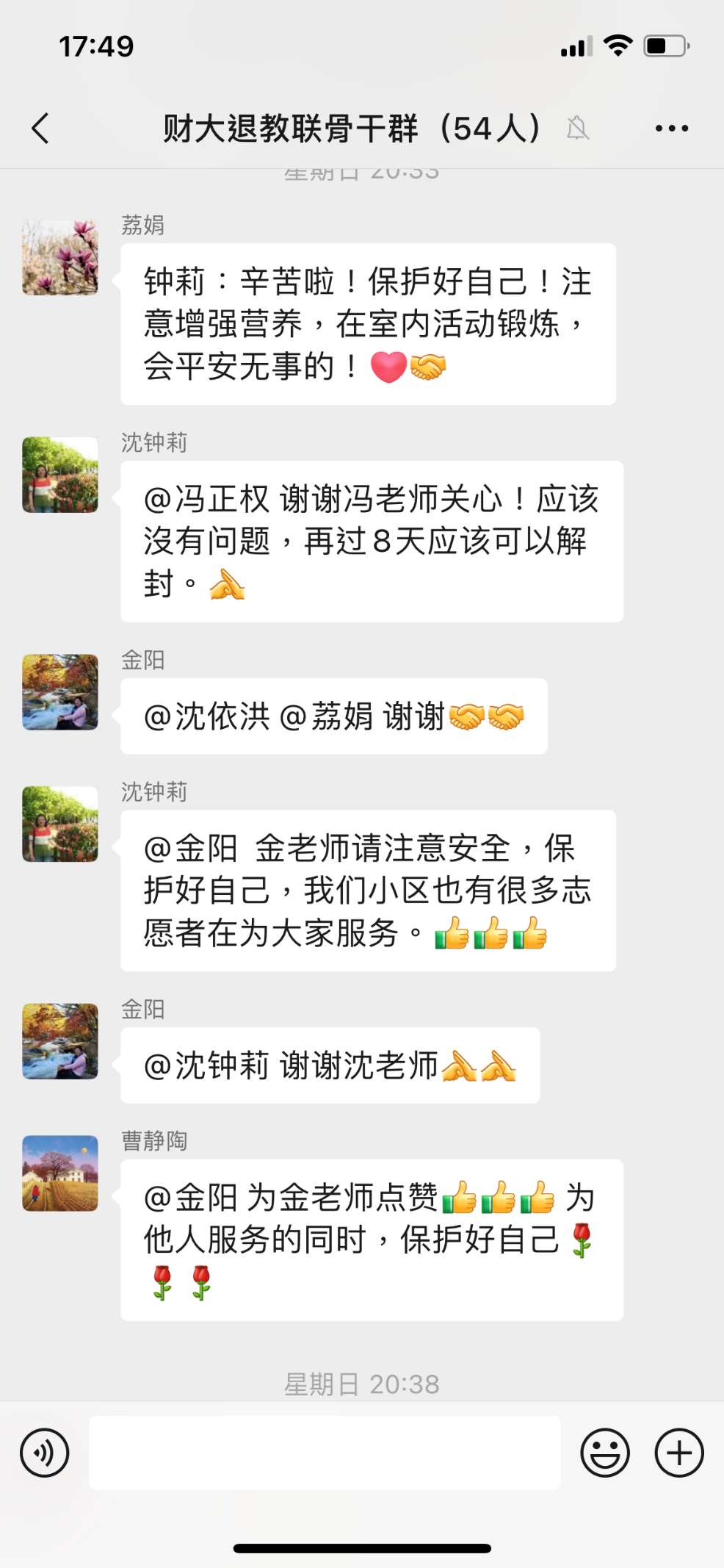 刚开始,只有少数重点风险区域的居民小区被封控。当第一批老同志在微信群中得知自己被封时,安慰鼓励的话语在网上就迅速不断地跳了出来,给了他们热情的关爱和心理安慰。校离退休党委、离退休处和协会特别关心独居、高龄和行动不便的老同志,总是第一时间通过电话、微信,及时传达学校疫情防控通知要求和老年人防疫指南,引导老同志科学防疫,保持乐观心态。虽然大家无法见面,但心是紧紧地连在一起的。