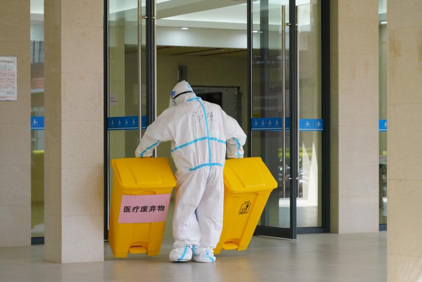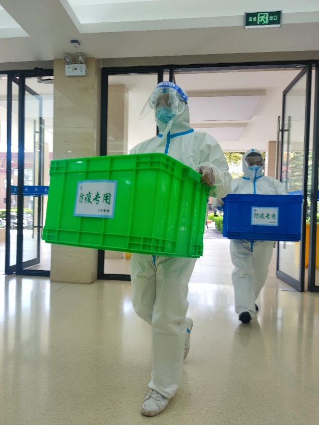 后勤处依据疫情防控工作有关规定,立即在封控楼宇区域安放有害废物垃圾桶。