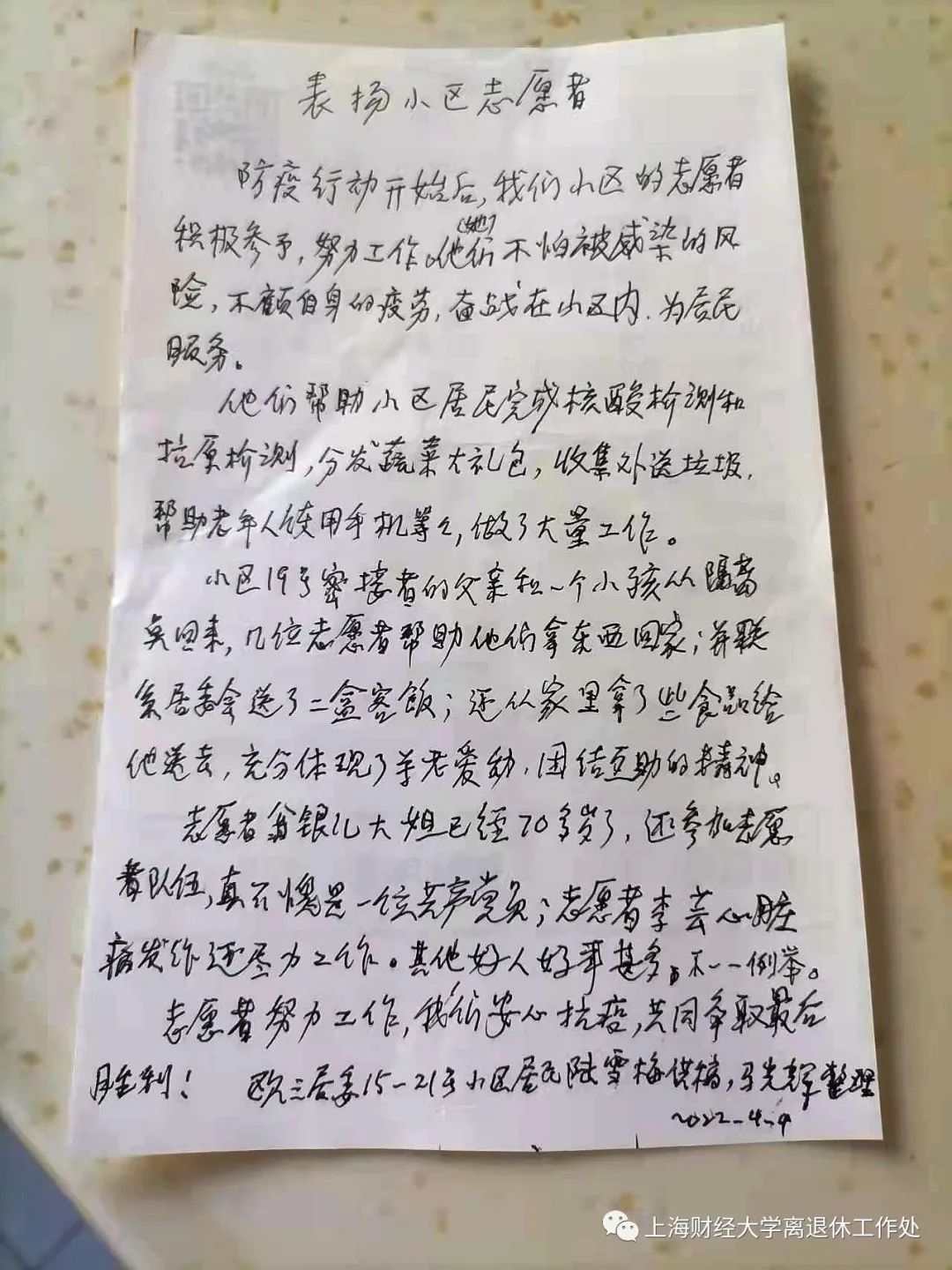 在上海抗疫工作进入最吃紧的关键时刻,上海财经大学广大离退休老同志积极响应市委、市政府有关部署要求,在校离退休党委和离退休工作处的领导下,扛起特殊责任,支持配合疫情防控和核酸筛查工作,互相关心,互相帮助,献计出力,共同抗击疫情。