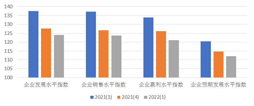 上海市企业家投资信心指数反映企业家对于本企业生产经营现状的满意程度和对未来的预期。如图3所示,本季度企业家投资信心指数的分类指数均呈现下降态势,其中表现当前企业发展状况的企业发展水平信心指数为124.00点,与上季度相比下降3.72点,同比下降13.53点;反映企业销售水平的企业销售水平信心指数为123.67点,环比下降2.96点,同比下降13.51点;企业盈利水平信心指数为121.09点,环比下降5.11点,同比下降12.86点。企业预期发展水平信心指数为112.06点,环比下降2.68,同比下降8.39点。