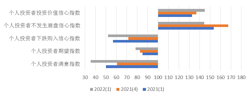 第一季度国内外疫情反复和国际大宗商品价格上升阻碍了全球经济复苏的进程,在这样的经济基本面下A股市场弱势震荡,板块分歧较大,整体投资收益偏低,导致个人投资者群体的满意度和预期降至历史低位。加之近期上海疫情的持续,更是加重了个人投资者对市场预期的悲观情绪。因此,本季度个人投资者的信心指数大幅回落至悲观区域。