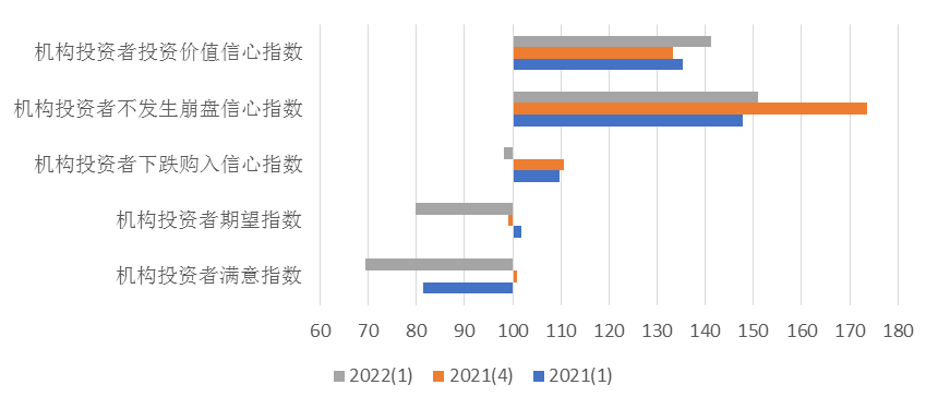 一方面,去年A股市场多个赛道板块涨幅过大,出现了股票价格与实际经济运行状况不匹配的情况,但多数板块上涨缺乏持续性,投资收益差强人意,导致机构投资者满意度明显下滑。另一方面,由于对外部美联储紧缩货币政策加速导致的风险以及内部稳增长政策调控力度的担忧,机构投资者风险偏好低迷的状态在短期内难以改善。但是,由于当前A股已经回落至较低估值,具备良好的投资价值,使机构投资者对A股投资价值的信心有所上升。