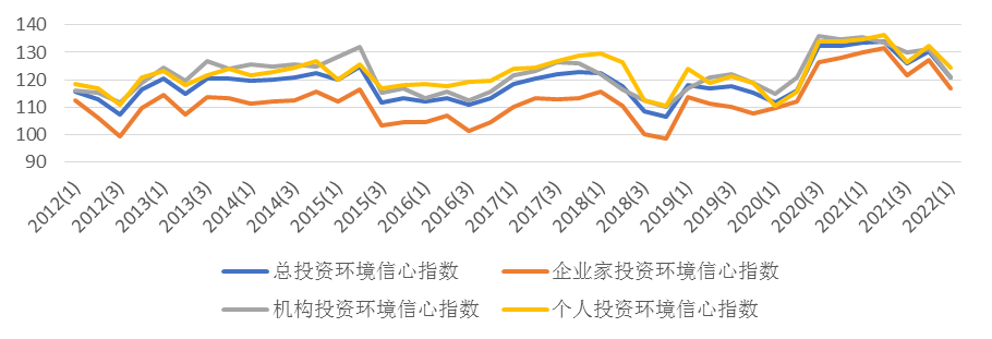 如图2所示,本季度投资环境信心指数的三个分类指数均呈现下滑:企业家投资环境信心指数为116.75点,环比下降10.44点,同比下降13.39点;机构投资者投资环境信心指数为120.97点,环比下降10.22点,同比下降14.58点;个人投资者投资环境信心指数为124.41点,环比下降8.17点,同比下降10.22点。