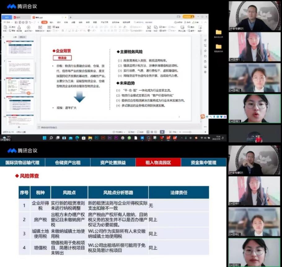 本届比赛分成两个阶段:分区赛和总决赛。分区赛考察注册税务师考试《税法一》基础知识和学生自编案例自行分析的能力,我校代表队顺利通过初赛进入总决赛。2022年4月15日举办的总决赛分为撰写案例分析和现场答辩两个环节,参赛队伍根据抽签确定的案例进行案例分析,并向评审组进行汇报,回答专家的现场提问。我校代表队凭借扎实的税务理论知识、严密的思维逻辑、流畅的税法知识应用和开阔的税务视野获得了评委的一致好评,案例汇报环节以第一的成绩在小组内脱颖而出,获得一等奖。