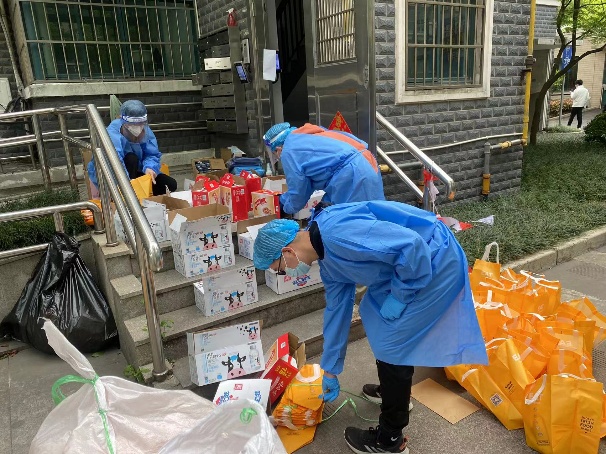 早上天微微亮时,配餐组的志愿者们已经集结,化身物资“配送员”开始早餐分拣、搬运、配送,将物资送到楼宇门前,中餐、晚餐亦是如此;每天要配送1350余份餐点,很多教职工志愿者上一秒还在上课,下一秒就去送餐;遇到被封闭的学生楼宇还需要上门派送、配送入户,倾力打通疫情防控工作的“最后一百米”。