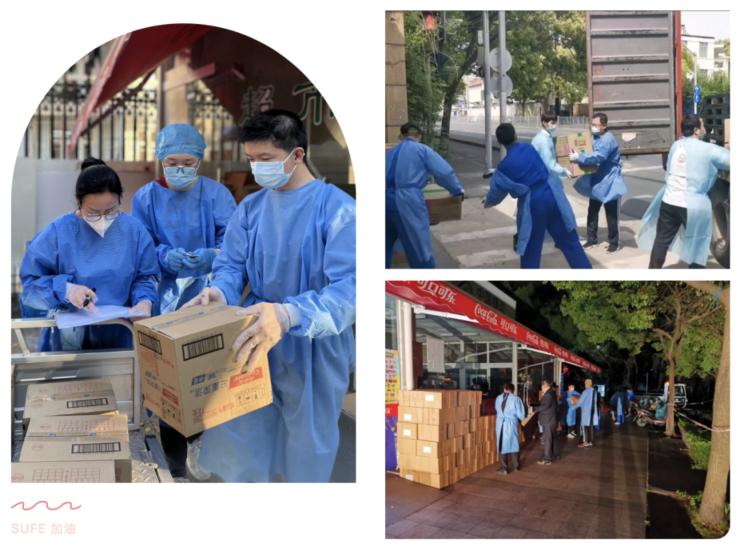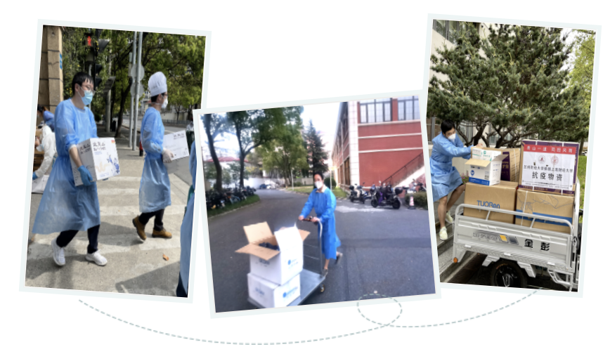 疫情之初,武川校区的所有留校教职员工都没有充足准备,他们没有食物储备和春夏交替的衣裤,很多教职员工为了让学生能按时吃上一日三餐、不耽误线上上课,他们都是自己饿着先给学生送饭。而当时所有餐食都是从国定校区的食堂运送过来,由于人力运力等原因, 送饭的老师们穿着大白在烈日下等待一两个小时也是常有的事情,加上高温天气,每次送餐结束后老师们穿着湿透的衣服、忍着饥饿拖着疲惫的身躯远去的背影深深触动了在场的每一个人。所以解决留校教职工的食物储备和夏天衣物成了燃眉之急。在城市交通管控、物资十分紧张的情形下,公共经济与管理学院一方面迅速联系校友会,短短两天时间就将校友捐赠的饼干牛奶等物资发放到武川校区的每一位志愿者手中;同时号召武川三所学院并联系学生处、校工会和校友,经多方辗转,筹措到了足够数量的夏季衣物,并逐一对照尺码分发给所有志愿者、后勤、物业和安保人员。