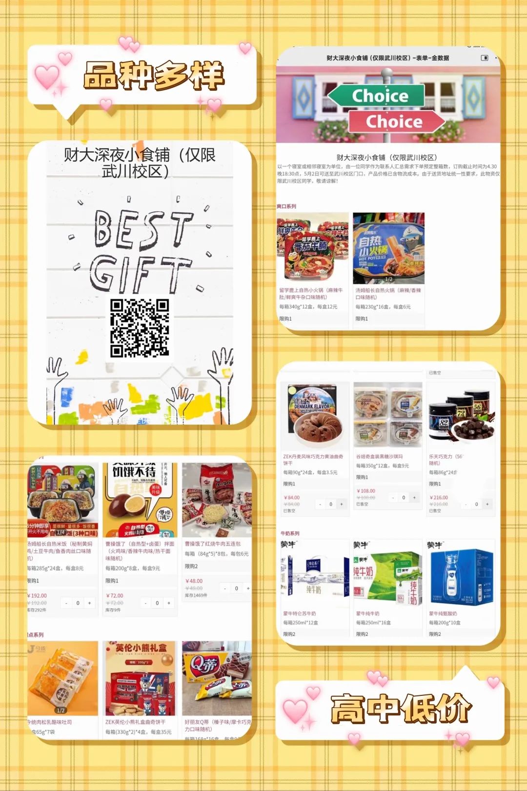 随着武川校区疫情好转,同时充分考虑到学生的诉求,团购开放了。本着既要满足丰富多样、又要考虑到学生消费水平以及非必需不团购的原则,武川战区联系了信息管理与工程学院负责电子商务的崔丽丽老师和信息办的王珊珊老师,在认真查验厂家相关资质后为学生上线了7种主食类食品(自热火锅、面条、自热饭等),4种奶制品,6种休闲小零食共计17种类型的团购物资。在送货之前严格查验厂商公司的运输通行证和驾驶员的核酸检测阴性结果。到达校区后,进行全面消杀静止放置后才能下发。