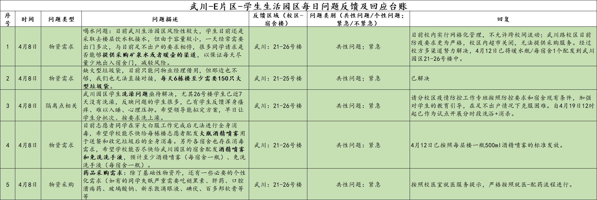 党政领导带头示范、统一指挥,学院专职辅导员、专业教师、行政老师纷纷响应“战疫令”号召,投身到武川、武东、国定、三门四大校区的防疫工作中。他们中有学生生活园区的“楼宇长”,与学生同吃同住在一起,负责楼宇学生情况动态掌控、楼层长队伍管理协调、突发情况上报处理等;有三门路战区一线的物资组“轮值组长”,在完成正常教学任务的间隙,还积极帮助搬运配送各种物资;有负责收集学生反馈问题的“情报员”,从物资需求、饮食建议、医疗救助、设备维修等多角度即时反馈同学们的诉求;有驻守学院帮忙处理各种行政事务的“大管家”,设备调试、文件处理、学院物资保障统统包揽,帮助校内外老师解决不少线上难以处理的棘手问题;甚至还有风靡一时的片区团长,与发货团长、收货团长、楼团长对接,负责整个武川校区团购订单数据的核对、收款和协调发放等工作。