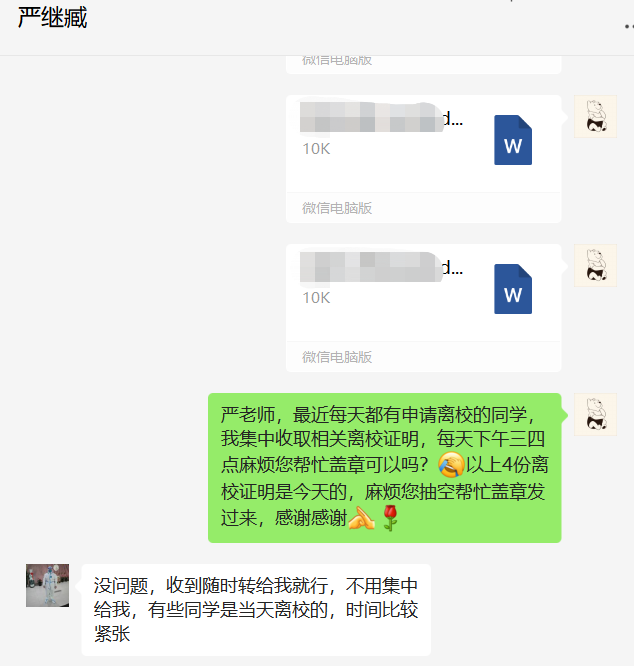 学院学工团队在校园封控管理期间“想学生所想、急学生所急”,坚持用真心、真情关爱和服务学生,在校学工老师及时协助解决学生诉求,为学生打印成绩单、拷贝数据资料、送药送物资等,解决学生急难愁盼问题。主办线上班会、毕业生就业交流会,化身“知心姐姐”缓解学生因封控压力、毕业压力、就业压力等产生的心理问题,将问题化解在萌芽中,平稳有序的完成学生“云”上毕业论文答辩,用实际行动关心关爱学生。