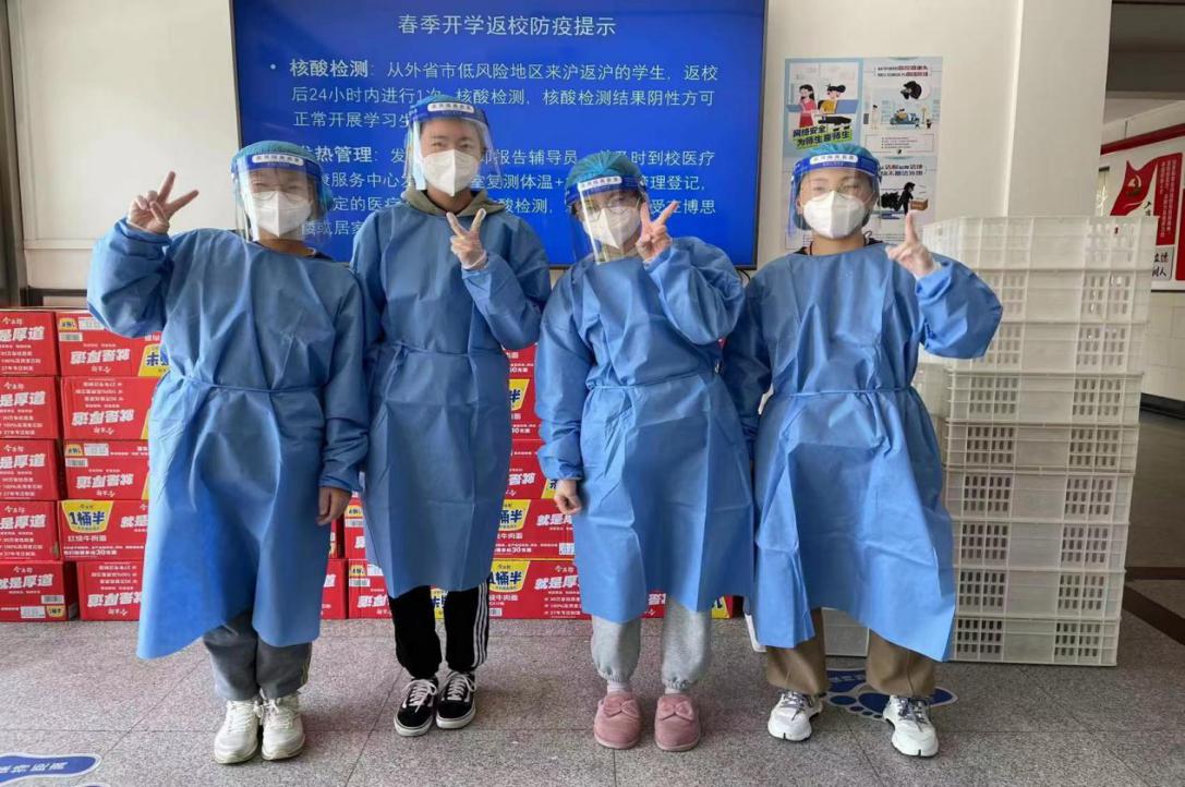 4月以来,统计与管理学院已有200余名同学参与到校园内的防疫志愿服务工作中。19级本科生张馨俪是学校防疫青年志愿者突击队的一员,从3月底至今,一直驻守国定路体育馆。4月7日,接到组建疫情防控青年志愿者突击队的通知“收拾一下东西,我们要住进新体了”,张馨俪便身穿“大白”,奔跑在校园战“疫”的跑道上,承担起协助医护人员核酸检测的工作。全员核酸期间,一班志愿者大概要负责一千多人的核酸检测工作。令她印象深刻的是,4月13号,受大雨影响,核酸检测进度较慢,她们在岗连续服务6个多小时后,收工回到新体时已经凌晨。一名学生干部,就是一面抗疫旗帜;一个学生团队,就是一座防疫堡垒。防疫青年志愿者突击队的工作是校园疫情防控中非常重要的一环,纵然有万般辛苦,志愿者们凝聚合力、一同克服。