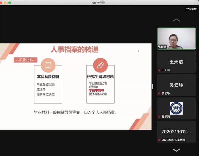 相信在多方的密切沟通、共同努力下,一定能够保障档案安全及时准确的转递工作,抢回时间,应对不确定性,为毕业生顺利毕业离校做好服务工作。最后,会议以答疑环节作为结尾,张起帆老师一一回应与会者们的疑问。