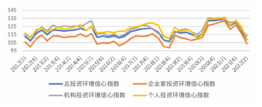 上海财经大学上海市投资者信心指数由一个指数系统组成,包括投资环境信心指数、企业家投资信心指数、机构投资者信心指数和个人投资者信心指数等四大核心指数,四大核心指数又由17个分类指数构成。各季度上海财经大学上海市投资者信心指数的具体指数运行情况参见图1。2022年第二季度上海市投资者信心指数的四大核心指数呈现两升两降态势,其中总的投资环境信心指数与企业家投资信心指数呈现大幅下降,其余两大指数呈现小幅上升。