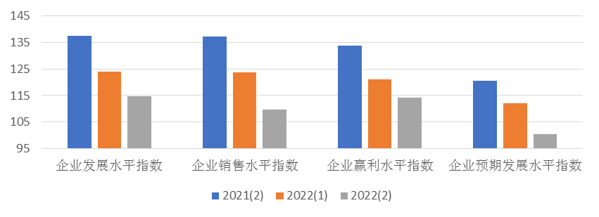 上海市企业家投资信心指数反映企业家对于本企业生产经营现状的满意程度和对未来的预期。如图3所示,本季度企业家投资信心指数的分类指数均呈现下降态势,其中表现当前企业发展状况的企业发展水平信心指数为114.81点,与上季度相比下降9.19点,同比下降21.05点;反映企业销售水平的企业销售水平信心指数为109.72点,环比下降13.96点,同比下降26.79点;企业盈利水平信心指数为114.09点,环比下降7.00点,同比下降18.61点。企业预期发展水平信心指数为100.28点,环比下降11.77点,同比下降21.38点。