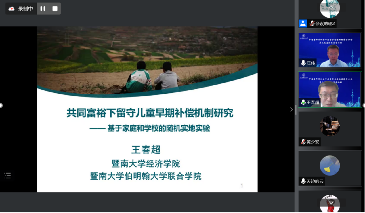王春超教授发言的题目为“共同富裕下留守儿童早期补偿机制研究”。王春超教授指出,从长期来看,教育投资尤其是儿童早期的人力资本积累对实现共同富裕的宏伟目标十分重要。由于家庭和学校在儿童人力资本积累中扮演着重要角色,在考虑共同富裕和减少教育不平等的背景下,帮扶学龄儿童的政策需要更加精准,对父母照料时间不足、人力资本相对匮乏的农村留守儿童应当给予重点关注。王春超教授通过开展对留守儿童的家庭和学校两方面的干预实验,比较分析了父母陪伴和学校辅导对留守儿童早期人力资本发展的短期与长期影响,指出在对留守儿童的帮扶政策中,既要考虑家庭整体的收入水平,也应比较家庭照料时间投入和学校帮扶的成本与收益,从而形成减少教育不平等的有效补偿机制。