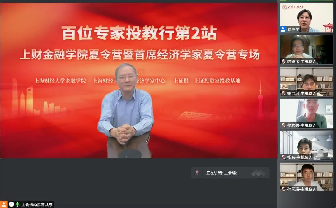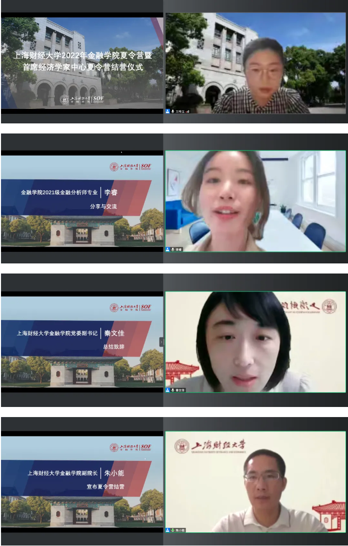 7月22日晚, 2022年上财金融夏令营暨首席经济学家中心夏令营结营仪式在线举行,由金融学院研究生辅导员万玲玉老师主持。首先由2021届本科毕业生、“救命文档”创建者、“2021年度感动上海年度人物”候选人李睿受邀与营员们交流分享,她从上财学习心得、学术研究、业界实习、学习与职业规划等方面向大家作了详细介绍。学院党委副书记秦文佳老师总结了夏令营情况,并寄语同学们从优秀榜样身上汲取力量,实现梦想,欢迎大家选择上财金融学院。金融学院副院长朱小能教授肯定了同学们在活动中的高度配合与精彩表现,期待与大家再见,并宣布本次夏令营活动顺利结营。