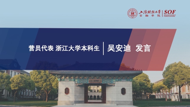 随后,来自浙江大学的吴安迪同学作为夏令营学员代表发言。他阐述了自己对于金融学以及金融学人的价值的理解,对于经济与金融共生发展的认知;期待在夏营中了解上财和中国金融发展的历史脉络,向博学多识的教授和业界精英学习;并以抓住时代机遇、实现个人价值与营员们共勉。