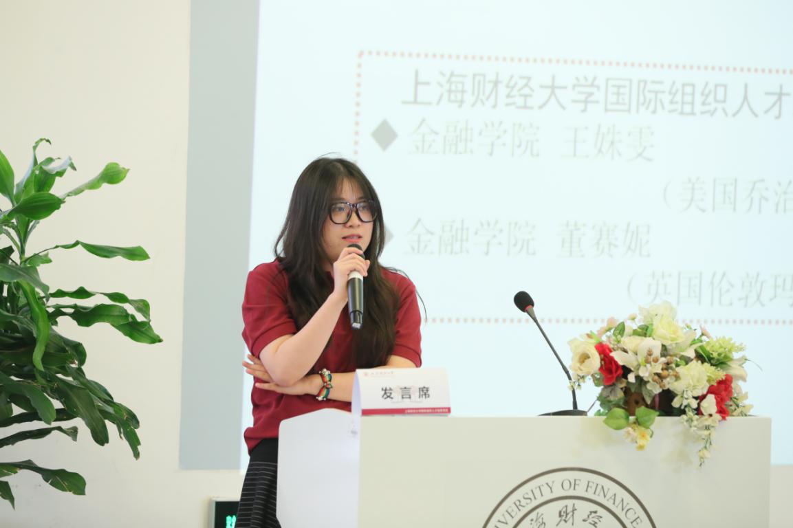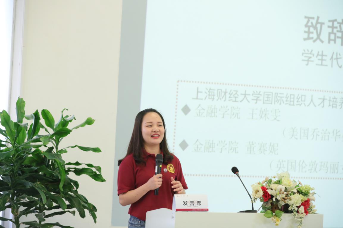 二期学生代表商学院李迩铮同学、法学院朱兰馨同学、金融学院王姝雯同学、董赛妮同学分别上台作了发言,分享了他们在国际贸易中心、世界银行国际金融公司、联合国教科文组织的宝贵实习经历。他们回顾项目三年海内外学习和国际组织实习,一步步走来充实而精彩,表达了对母校和项目的诚挚感恩,希望更多财大学弟学妹未来投身到国际组织的舞台上,开启独属于自己的美丽旅程,让世界听中国的声音,也让中国听世界的声音。目前分别在联合国开发计划署、联合国教科文组织实习的秦锦和罗汉杰同学也通过视频,表达对母校和项目的美好祝愿,对未来财大学子的殷切期望。