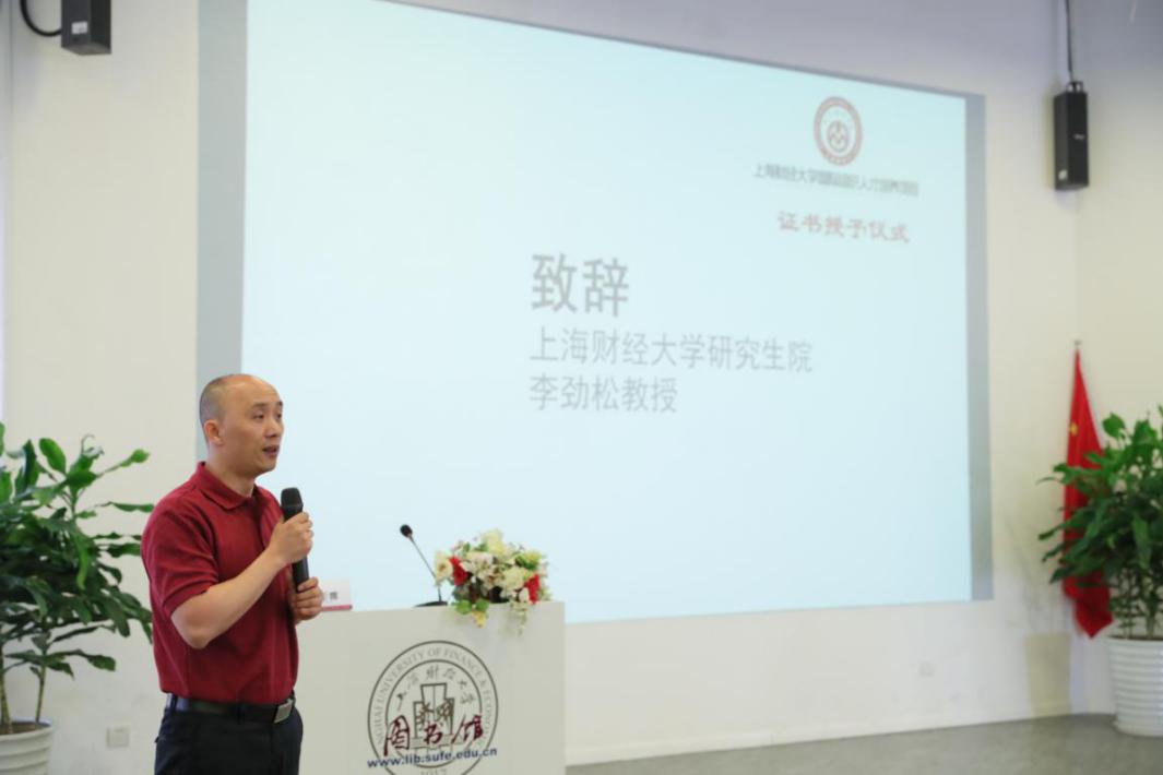 上海财经大学研究生院副院长李劲松教授上台发言,分享了项目设立之初发展至四期、五期的心路历程。他对学校各部门、各学院及研究生院各位老师、学生家长表达了感谢;祝愿一期、二期的同学未来走上工作岗位,继续把握国际组织实习和任职机会,争取更高更远的发展平台;勉励三期、四期同学珍惜在校时间和学校及项目打造的平台机遇,踏实奋进,成为更好的自己。