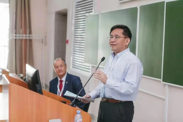 中国数学会副理事长、上海财经大学数学学院院长程晋教授代表中国参会代表致辞,简单介绍了在2018年开始,俄罗斯科学院西伯利亚分院、俄罗斯国立新西伯利亚大学、哈萨克斯坦国立大学等大学和研究机构的著名学者受中国国家外国专家局“一带一路”教科文卫引智计划资助,来到上海财经大学进行的国际学术合作和在此基础上开展的“一带一路”国际科研协作活动,对组织方的精心组织和细心安排表示衷心感谢,并欢迎与参会代表能在“一带一路”项目框架下开展更多的数学及其交叉研究领域开展深度且有成效的交流与合作。