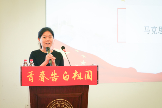 在青春见证成就篇章,全体师生观看了《千村调查师生共话爱我中国》的视频。3名千村调查优秀学生代表分享了我的千村故事。金融学院的本科生雷永翀分享了脱贫攻坚的青春印记。他通过深入国家级贫困县道真县的9个村调研,亲身感受到了农村所发生的天翻地覆的变化,感受到了脱贫攻坚所取得的巨大成果,更加坚定了“青年一代在实现中国梦的生动实践中放飞青春梦想”。来自金融学院的本科生曹天姿分享了一个老兵的家国情怀,呼吁当代青年也要把自己投入到时代发展的洪流中去,与祖国同呼吸、共命运,把自己的青春书写在祖国的大地上,把中华民族爱国、奉献的民族文化,世世代代传承下去。来自马克思主义学院的硕士研究生沈磊分享了哈尼梯田的文化传承。他通过深入哈尼村寨主讲千村大讲堂,并开展入村入户调研,希望新时代青年应把个人前途与祖国命运紧密相联,才能大有作为。3位同学的精彩分享,见证了我国乡村振兴的成果,见证了祖国改革开放的伟大成就,激励了上财学子奉献祖国的热情和信心。