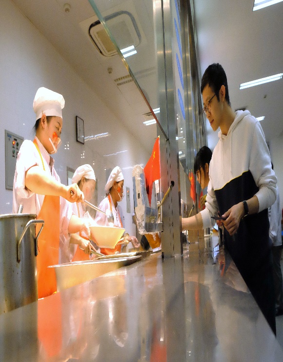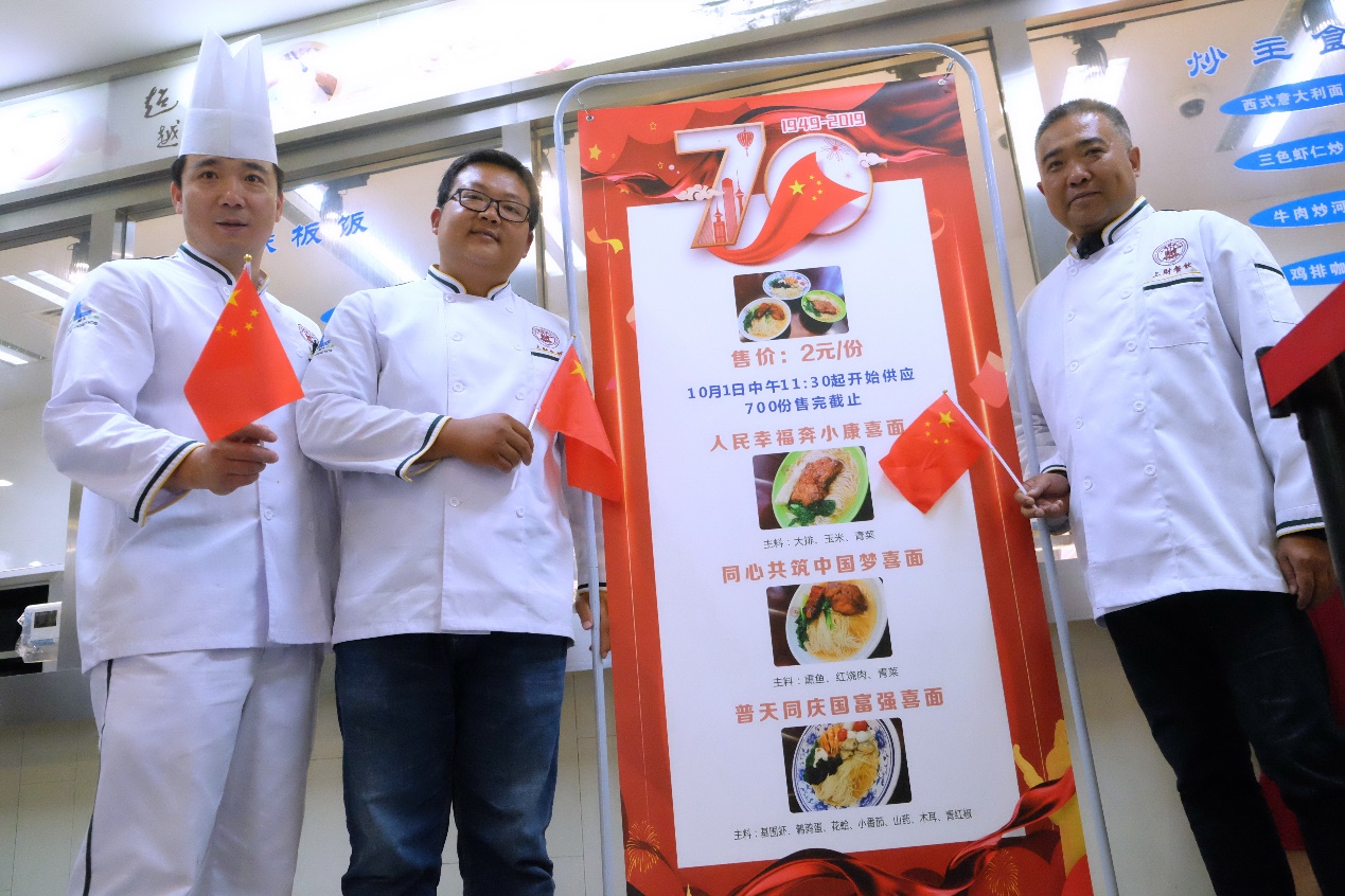 为弘扬爱国爱家、家国同乐的爱国情怀以及弘扬中国传统文化,我校后勤中心积极响应市教委号召,国庆节当天中午在武东路新食堂一楼推出了“国庆喜面”特色餐饮服务。为突出主题,结合后勤中心服务育人、文化育人的理念,在喜面的取名上结合“两个一百年奋斗”目标,体现全国人民在中国共产党的领导下对祖国富强和民族复兴的热切期盼和美好愿望,推出了“人民幸福奔小康”、“同心共筑中国梦”、“普天同庆国富强”三款喜面。