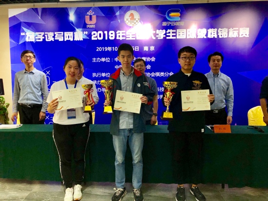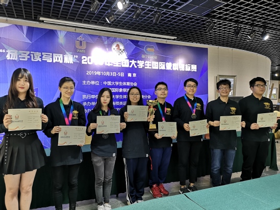 10月5日,由中国大学生体育协会和中国国际象棋协会主办、江苏省棋类协会承办的2019年“扬子读写网杯”全国大学生国际象棋锦标赛在金陵城江苏南京落下了帷幕。来自北京大学、复旦大学、南开大学、上海财经大学等全国各地41所高校的85名运动员参加了本次比赛的角逐,我校国象队共派出了四男四女共八名棋手参赛,经过三天的鏖战和拼搏,获得了等级组混合团体冠军和个人赛一金、二银、一铜的好成绩。
