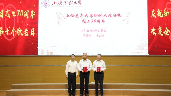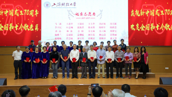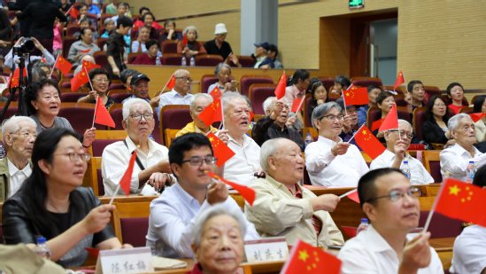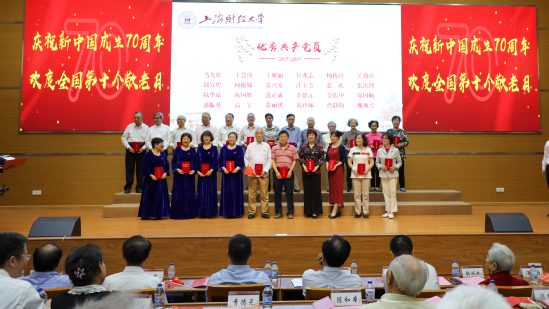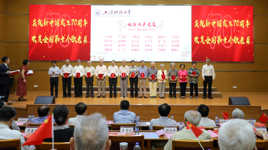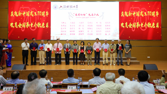 表彰活动在老同志第二春合唱团《这就是我的祖国》和《我和我的祖国》歌声中拉开帷幕,满场舞动的五星红旗,映衬着一张张幸福的笑脸。今年恰逢我校老年大学成立20周年,在颁奖仪式上,首先为老年大学创校校长,原校党委副书记季德元,离休干部、原国际处处长马光辉颁发了老年教育特殊贡献奖。大会对2017年来,积极参加学校老同志各项学习和活动并热忱为老同志服务的30名优秀志愿者、30名“老有所为”先进个人,对24名获优秀共产党员称号、6名优秀党务工作者和一个先进党支部进行了表彰。目前全校共有938位离退休老同志,其中56位老同志出生在1949年,幸运的与共和国同龄。在欢乐的乐曲中,他们中的代表走上了主席台,高兴地接受许涛和蒋传海向他们颁发的“我和共和国同龄”的祝寿纪念品。