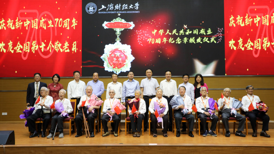 最后隆重颁发的是“庆祝中华人民共和国成立70周年”纪念章。我校有22位离休老同志荣获这枚中共中央、国务院、中央军委颁发的纪念章。会上10位精神矍铄的离休老同志代表走上主席台,许涛和蒋传海向他们颁发了代表国家荣誉的纪念章。顿时,全场爆发出一阵热烈的掌声,大家向这些曾经为共和国的诞生,为革命和建设事业作出卓越贡献的老战士致以崇高的敬礼。
