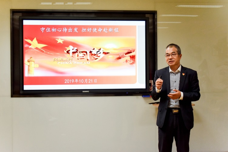 受聘仪式后,杨玉成校友为各位党员上了题为《守住初心待出发,担好使命赴新程》的主题党课。他以《忆秦娥·娄山关》开场,深入解读了这首词的创作背景以及与本次主题党课的联系,围绕中国共产党人的“初心”和“使命”、“守好初心、担好使命”的基本要求以及“守住初心、担好使命”要做到什么三个问题展开分享。他指出中国共产党人的初心和使命,就是为中国人民谋幸福,为中华民族谋复兴。通过分析1979年与2017年我国各项主要经济指标,充分说明了中国共产党为人民谋幸福、为民族谋复兴的成效;通过分析中国女排、《义勇军进行曲》、长征精神、国庆阅兵以及自身经历等多个生动的例子,提出了目标坚定、意志坚定和行动坚定这三个社会主义建设取得显著成绩的重要原因。他阐释了守好初心、担好使命的基本要求,就是要增强“四个意识”、坚定“四个自信”、做好“两个维护”,大家不能只有自我意识,要有大局意识;即使遇到艰难险阻,也要有信心的坚定走下去。他还进一步回答了如何“守住初心、担好使命”:一是要切实明确自己的初心和使命,二是要切实解决好“四个危险”,三是要全心一致提升自己,四是要坚信金子总会发光。杨玉成校友认为每个人都要有自己的初心和使命,每个人都是一颗螺丝钉,都要遵循初心,把自己的事情都做好,人生的路才能越走越远。