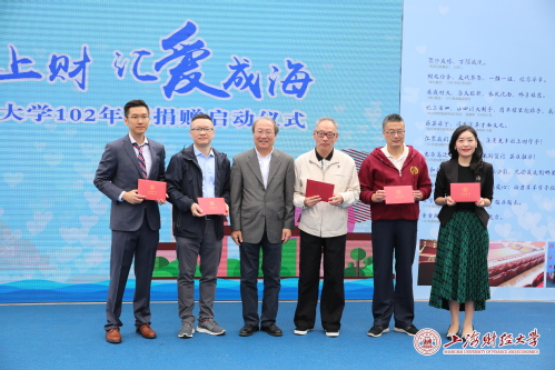 与此同时,“情系上财 汇爱成海”上海财经大学102年度捐赠启动仪式在新体育馆的广场举行。学校合作发展处处长、基金会秘书长陈红梅主持启动仪式,上海财经大学副校长、基金会理事长方华;上海泽稷教育培训有限公司副董事长王菲菲;69届校友代表沈潇;89届校友代表张永新;99届校友代表吴元青;09届校友代表诸葛胜聪以及返校校友和在校师生代表出席了此次启动仪式。