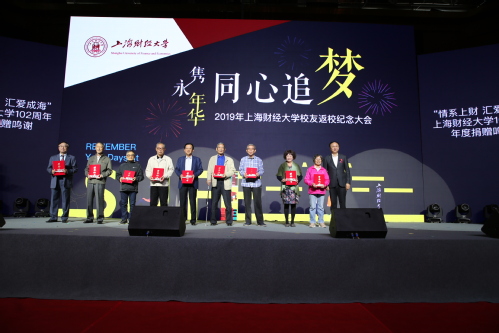 “情系上财 汇爱成海丨校友年度捐赠”是上海财经大学教育发展基金会与校友会于2014年开始推出的公益项目。今年的年度捐赠得到了返校校友们的热烈响应。短短的十多天里就有1386人次的校友参与了此次活动。点亮图书馆台灯、认养校园树木、冠名体育馆座椅等捐赠活动让爱予母校的情谊在血液里奔腾,创造了属于上财人的公益氛围。纪念大会上许涛书记、徐飞常务副校长、朱鸣雄副书记、姚玲珍副校长分别为1969届、1989届、1999届和2009届捐赠班级代表颁发了捐赠证书与纪念品并合影留念。