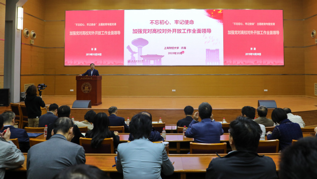 “推动国际化办学是上海财经大学102年发展历程中最鲜明的底色,加强党对教育对外开放的全面领导,扎根中国、放眼世界、立德树人、追求卓越,是我们永远追求的使命。”10月30日上午,按照“不忘初心、牢记使命”主题教育工作部署,校党委书记许涛在创业中心报告厅以《加强党对高校对外开放工作全面领导》为主题,为大家讲授“不忘初心、牢记使命”主题教育专题党课。教育部第六巡回指导组组长朱拓、成员谢峰列席。专题党课由校长、党委副书记蒋传海主持。校领导班子成员、全体中层干部和师生党员代表等参加了专题党课学习。