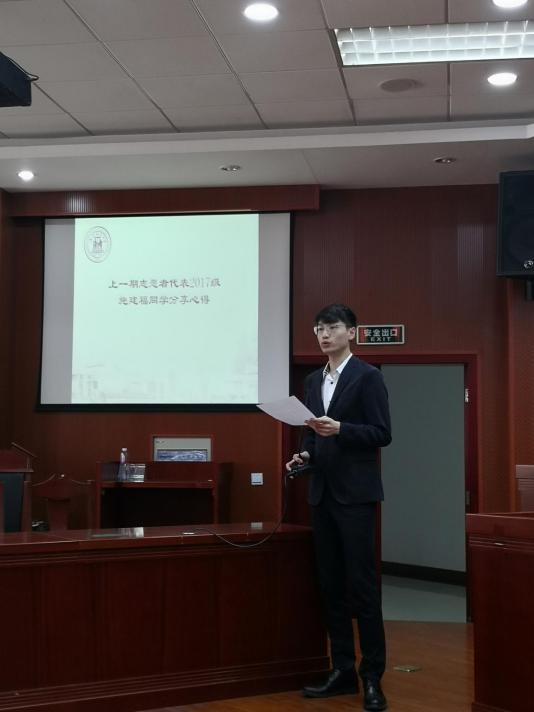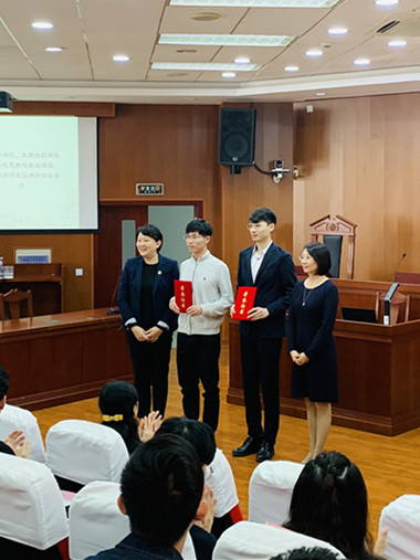 上一学年优秀志愿者代表2017级施建福同学分享心得。施同学向大家介绍了上一学年志愿者在“普法进社区”活动中具体开展的工作以及同学们的学习收获,并鼓励新一届志愿者学弟学妹们能再接再厉,为社区提供更多专业的法律服务。随后,陈向阳书记、王雅静副部长向优秀志愿者代表施建福、鲍伟同学颁发证书并合影留念,以表示对学生志愿者们的感谢和鼓励。