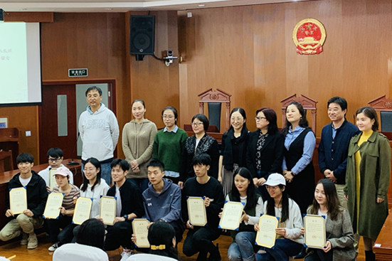 10月30日下午,杨浦区市民终身学习体验基地--上海财经大学模拟法庭开播仪式暨上海财经大学法学院普法进社区志愿者结对仪式在武东校区梯八教室举行。杨浦区学习办党支部书记兼综合部部长陈向阳、项目部副部长洪礼珍、项目部张伟,上海财经大学宣传部副部长王雅静,上海财经大学法学院党委书记杨乐、副书记罗山鸿、法学院实践教学中心主任李睿、学工办副主任刘明,杨浦区十二位街道社区学校常务副校长,杨浦区社区代表以及法学院上一期普法工作优秀学生志愿者代表和法学院新一届学生志愿者代表出席本次活动。活动由法学院党委书记杨乐主持。