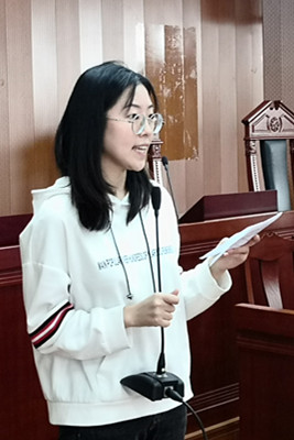 接下来,本期志愿者代表2018级陈晓涵同学介绍新一期社区普法活动的项目内容和课程情况。她从整体上对本期社区普法志愿活动进行了展望,向大家简要概述了志愿者团队打造的12个课程组的课程内容和具体安排,并表示新一期普法进社区志愿者团队将会把自己最专业的水平融入具体案例中,呈现给社区居民。
