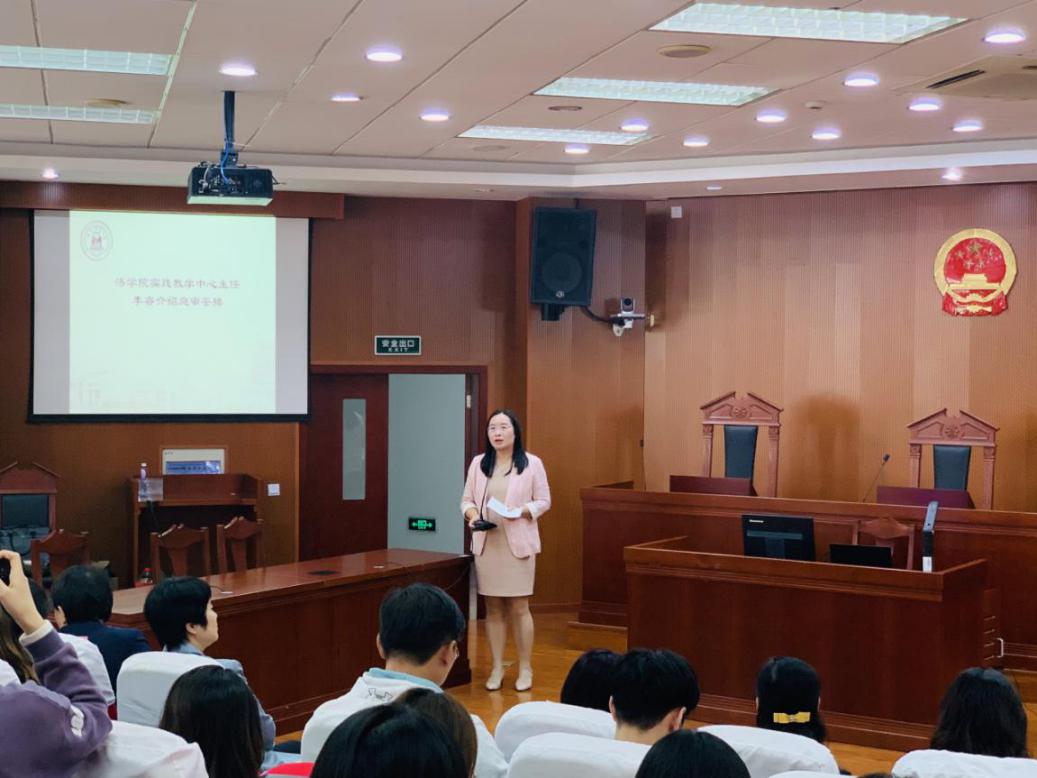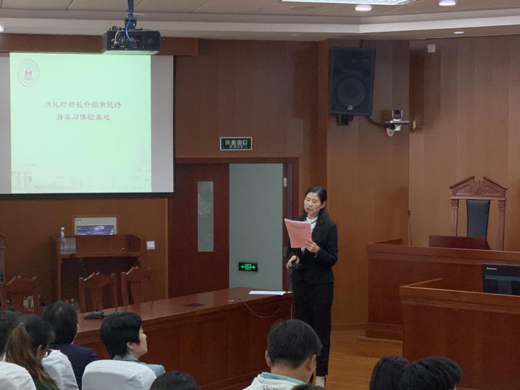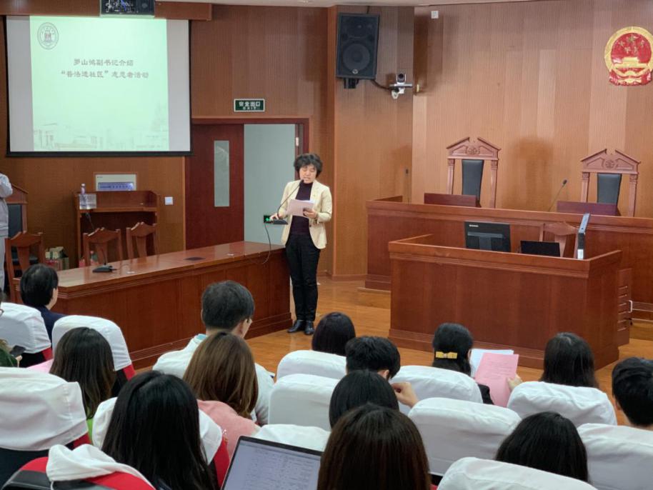杨浦区学习办项目部洪礼珍副部长介绍市民终身学习体验基地,并对上海财经大学法学院过去在市民普法活动中所开展的工作表示十分认可,对法学院所打造的模拟法庭作为杨浦区市民终身学习体验基地和普法进社区品牌活动表示高度赞扬。同时洪部长还表达了对普法进社区志愿者的感谢,并对接下来的新一期社区普法项目充满期待。