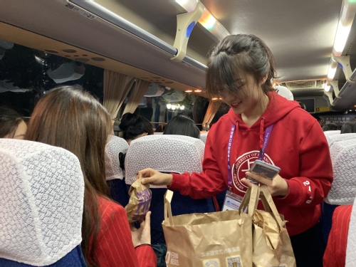 开幕日当天,从凌晨到中午,上财志愿者们分为四拨从学校出发。学校为不同批次的志愿者们配送了早餐和午餐,考虑到凌晨出发的第一批志愿者们到场馆有早餐发放,就专门为他们准备了热饮料暖胃驱寒;而后面两批志愿者的早餐,考虑到在园区可能一整天都会吃面包,便专门为他们预订了可口的早餐。下午服务结束时,学校还根据回校时间段,分批次为志愿者们发放牛奶、巧克力、饼干等能量零食包以及配送志愿者晚餐。