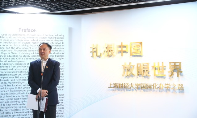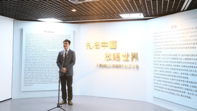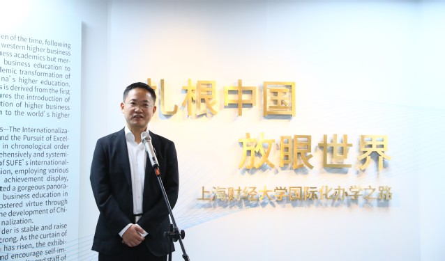 首先,校党委书记许涛致辞。许书记指出,回顾学校历史,可以看到国际化办学是上海财经大学102年发展历史的重要基因和鲜明特色,也是学校发展的一个重要路径。上海财经大学一直具有敢为人先的精神和传统。建校之初,创校先贤就引入先进教育理念,聘请具有国际学术背景的一流师资,为学校发展打下重要基础。1978年改革开放和复校以来,学校的对外开放办学和中国的改革开放相伴而行,努力探索、大胆实践,学校整体水平不断提升。2004年起,学校在全国率先开始大规模引进海外师资,为学校的学科建设、科学研究和人才培养等多方面的发展起到重要推动作用。沿着学校国际化办学的发展历史,在今年召开的第八次党代会上,学校党委进一步提出了建设具有鲜明财经特色世界一流大学的宏伟愿景,谋划了三步走的战略目标。在新的起点和新的征程,希望一代又一代的上财人能铭记学校办学的初心,思考和践行肩负的使命。希望通过参观这个展览,帮助全校师生、特别是青年一代来感悟和了解学校的国际化办学之路,更好地继承学校的优良传统,大家一起和学校党委同向而行,共同实现这一宏伟目标。