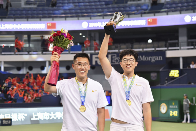 值得一提的是男子丙组双打决赛在上海大师杯中心球场上演。我校杜士博和高焌桐两位队员在和来自华东理工大学的选手进行了比赛。对能获得这次难得的机会,踏上费德勒、德约科维奇比赛的中央球场比赛,队员们都激动不已。两位队员放弃自己的十一假期在学校加紧训练,希望能在现场为校争光。现场更是集齐了来自上海市十余所高校的观众,加油声此起彼伏。最终我校队员不负众望,将男子丙组双打冠军收入囊中。