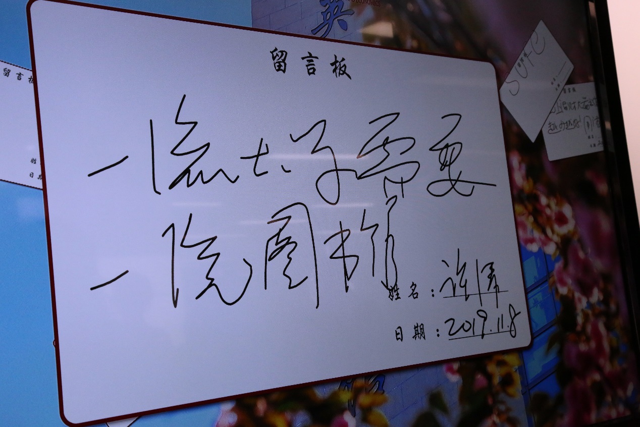 揭幕式结束后,在图书馆馆员的引导讲解下,校领导及嘉宾们实地参观了上海财经大学学术展示·共享空间,并对图书馆留言寄语。