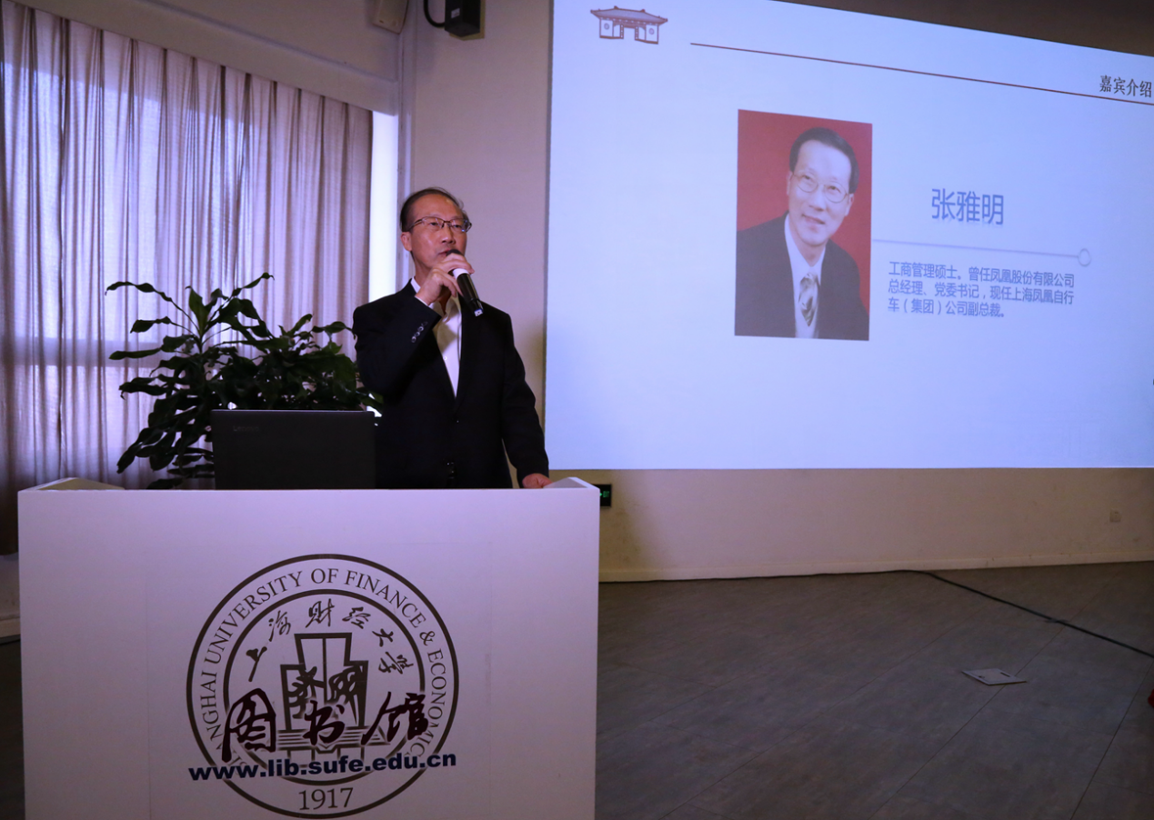 上海凤凰自行车(集团)有限公司副总裁张雅明致辞,回顾了上海凤凰自行车有限公司与上海财经大学的历史渊源,并表示上海财经大学对上海老工业名片的展示与宣传有效体现了海派文化的传承,并激励着凤凰自行车厂重新出发,走出国门,走向世界。